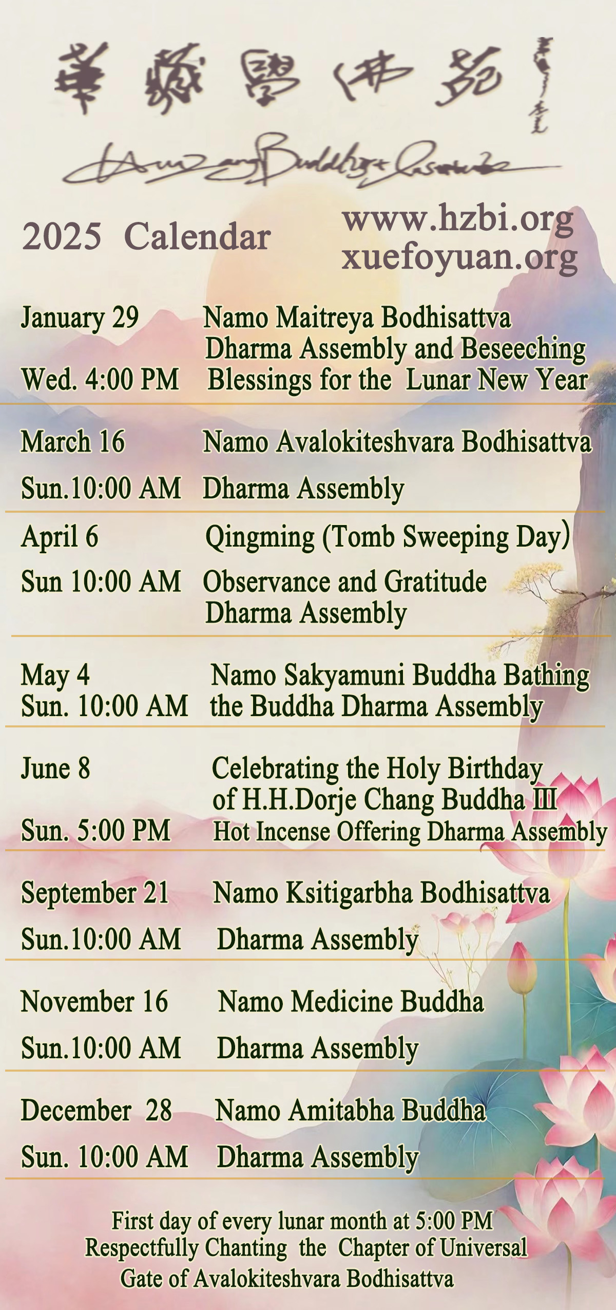 HUA ZANG BUDDHIST INSTITUTE 2025 CALENDAR admin 226文章 0评论 18 11 月, 202419:58:15Uncategorized评论2471阅读模式 文章末尾固定信息 【REPRINT】HHDCBIIICAM – Respectfully Honoring the Holy Birthday of His Holiness Dorje Chang Buddha III 【 Video】Jiang Gong Kang Rinpoche ‘s Video Testimony in 2003 【Video】Buddhas and Bodhisattvas Honoring the Treasure Book HH Dorje Chang Buddha III by Bestowing Nectar 35 Answers Important Replies from Holy Virtuous Ones and Eminent Monastics 1 https://xuefoyuan.net/441/ 复制链接 复制链接 我的微信 我的微信 微信扫一扫